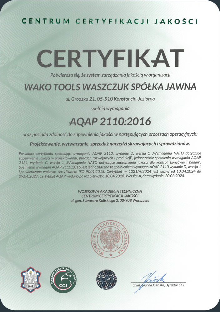 Obecnie produkujemy narzędzia skrawające katalogowe oraz specjalne dla nowoczesnych linii automatycznych, do napraw maszyn budowlanych, poligraficznych, spożywczych, hutniczych jak i również dla motoryzacji i lotnictwa i kolejnictwa. Jesteśmy firmą specjalizującą się w produkcji narzędzi skrawających ale bardzo dynamicznie rozwija się produkcja sprawdzianów oraz innych przyrządów pomiarowych.